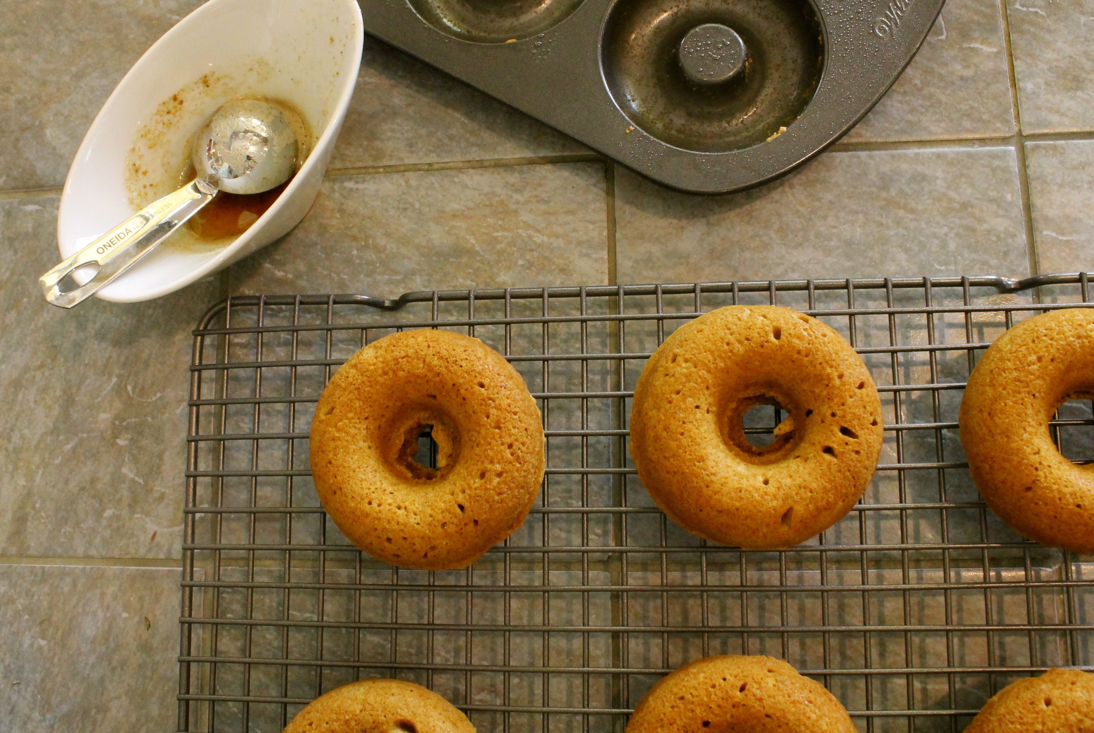 Heat the oven to 350 degrees. Grease your donut pan.