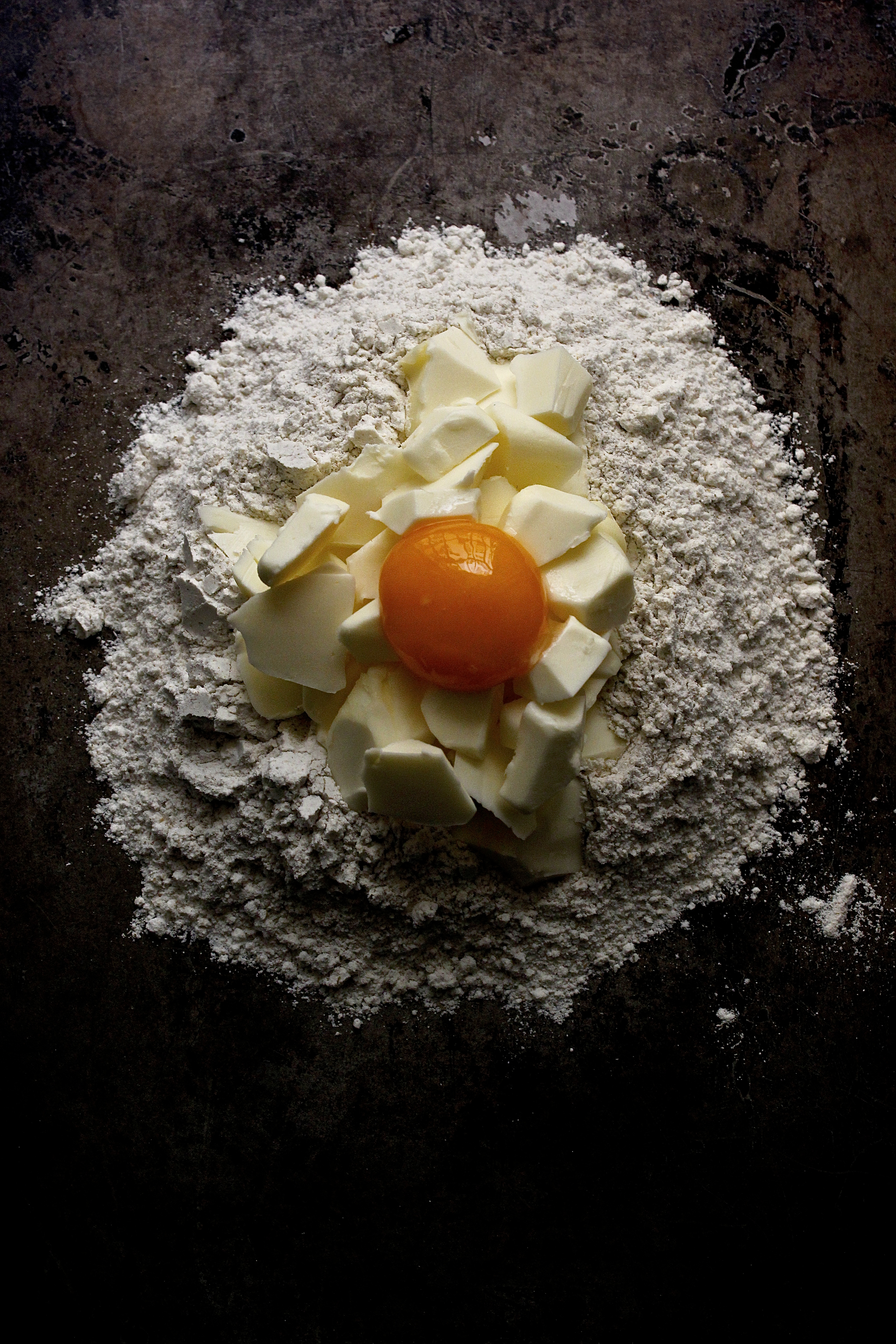 Start by making the pastry. In a bowl whisk together the all purpose flour, rye flour, salt and ground cardamom. Form a well in the middle and add the butter and egg yolk. Using a knife or a pastry cutter, cut the the butter into the flour until the mixture resembles sand. Using your hands quickly bring everything together – if the mixture appears crumbly and dry, add 1-2 teaspoons of cold water. Shape into a ball, wrap in cling film and place in the fridge for 30 minutes.