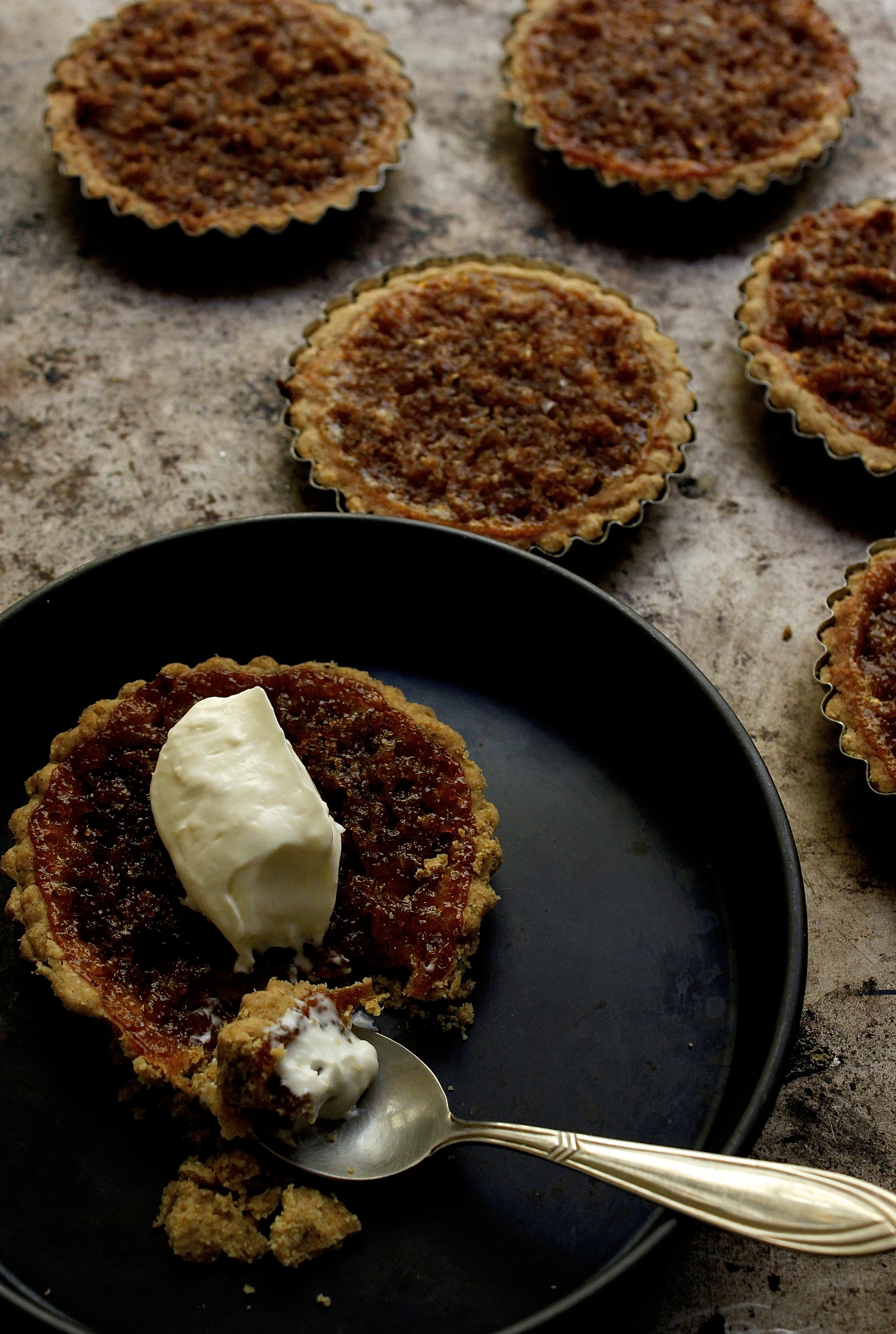 Note: these individual treacle tartlets are made with rye flour and are filled with rye breadcrumbs. Rye always makes me think of Scandinavia so the pastry includes a generous pinch of freshly ground cardamom as well. And while I am particularly fond of this rye bread version of the filling, there is nothing that says you could not use a slice or two of your favourite country loaf for the filling. The important thing is to pair the treacle tarts with something that will cut through the filling’s almost tooth-aching sweetness. A lemon scented cream works well, only lightly sweetened, if at all. A scoop of lemon curd or greek yoghurt ice cream would work too.