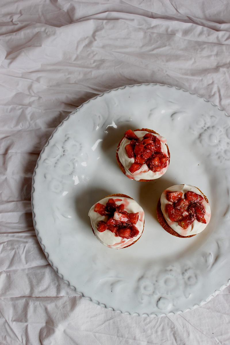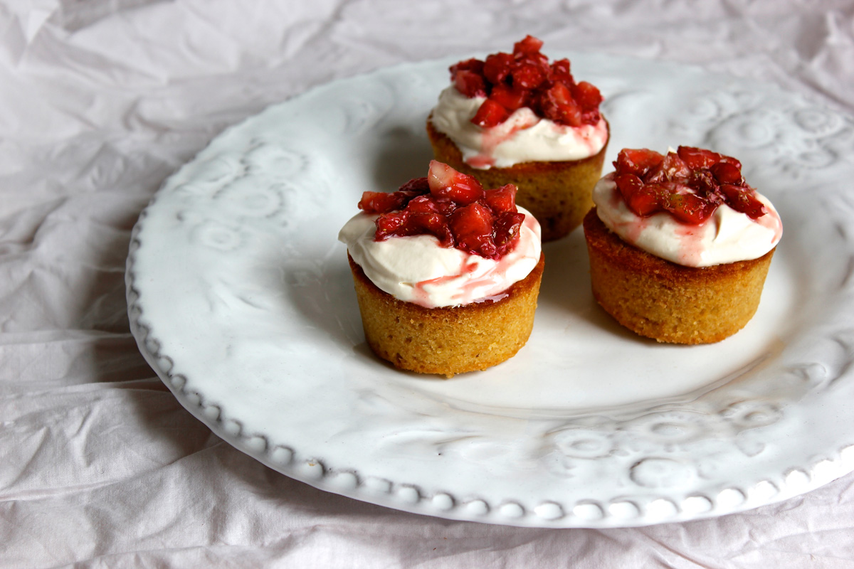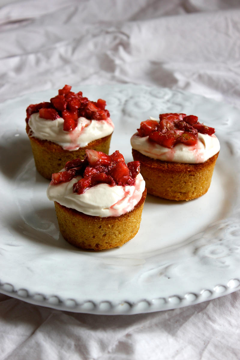 Depending on how many I am serving I also like baking individual Victoria Sponge cakes, using muffin tins to bake small, cupcake sized sponges. Rather than splitting these small cakes in half, I like simply topping each with a generous dollop of whipped cream or crème fraîche and a spoonful of my favourite jam, or even some macerated berries or fruit compote.